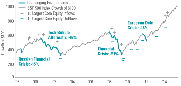 We believe there is an important lesson in the last 15 years’ history of fund inflows and outflows versus market performance: The value of a long-term mindset. An investor who gained exposure to US equities during each period of a major inflow in the last 15 years would have enjoyed price appreciation had they held on long enough. But both the inflows and outflows suggest that many investors did not heed the old adage about long-term investing.