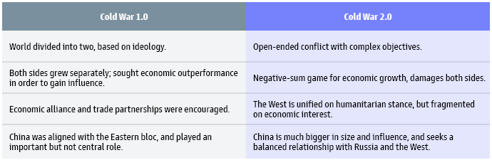 The ongoing confrontation between Russia and the West has renewed concerns about a developing Cold War 2.0. Compared to the broad ideological conflicts that took place in the 20th century between the Eastern and Western blocs, the initial phases of Cold War 2.0 have been more targeted and localized. However, it appears likely to do more damage to global economic growth and cooperation—and without nearly all of the silver linings associated with the first one. Considering the economic, political, and humanitarian costs for all sides, Cold War 2.0 may not have a winner. In current conditions, we expect commodities to play a more central role in driving economic growth than they have in previous business cycles. The traditional investment playbook should also be re-assessed to account for elevated geopolitical risks across developed-market (DM) and emerging-market (EM) opportunity sets.