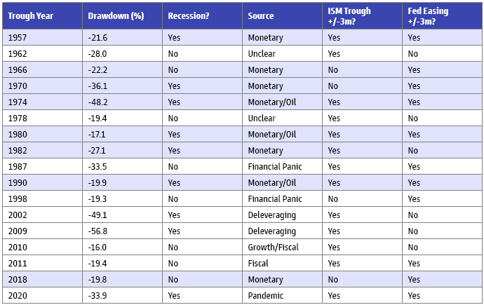 Source: Goldman Sachs Global Investment Research and Goldman Sachs Asset Management. As of June 14, 2022. “Drawdown” refers to the S&P 500 maximum peak-to-trough price decline during each specific period. “Trough” refers to the minimum S&P 500 price within each specific drawdown. “+/-3m” refers to three months before or after market bottom. “Monetary” refers to bear markets primarily caused by tightening in monetary policy. Past performance does not guarantee future results, which may vary.