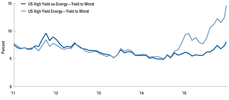 - We think the credit cycle has further to run but concerns are mounting as it advances into the late stage, and given the risk of contagion from the distressed energy and mining sectors. These concerns are keeping us from being more positive on risk assets, but we remain constructive on corporate credit as we think current valuations reflect an overly pessimistic scenario for the global economy and markets.