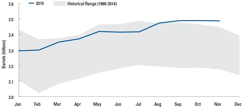 - The commodities market downturn doesn’t look likely to let up any time soon. We see potential for additional near-term downward pressure on oil prices due to concerns that storage is getting close to full capacity.