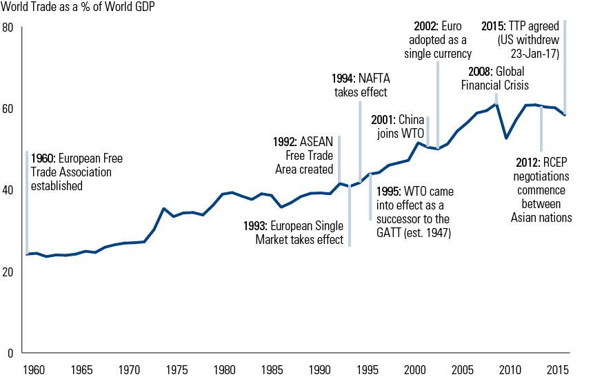 This Macro Insights explores the “Globalism to Populism” transition outlined in our 2017 Investment Outlook through the lens of trade. We’ve asked our investment professionals to share their views on the market and investment implications of evolving trade policy, as protectionism could reconfigure trade relationships globally and plot a new distribution of winners and losers.