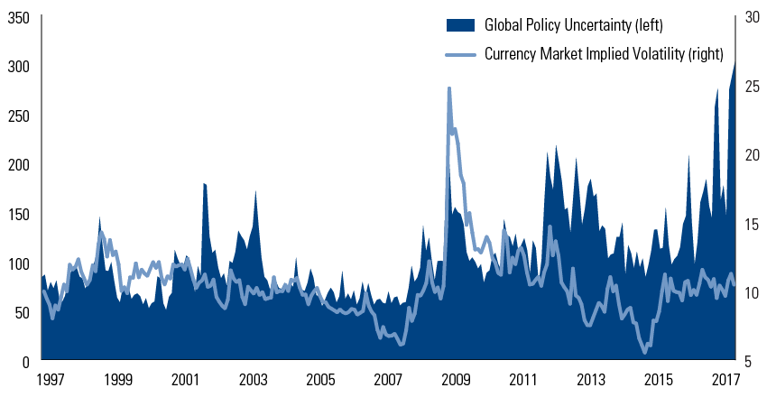 The dollar has strengthened a decent amount since the US election and we think valuations are extended. However, we are positioned for further moderate gains in the near term against other developed market currencies. We expect a modest bounce as the market adjusts to a faster pace of Fed tightening—our base case is for three interest rate hikes this year, based on fiscal expansion and provided that financial conditions don’t tighten too much. And we see more upside for the dollar in the event of trade disruptions, which could drive safe-haven flows to the US.