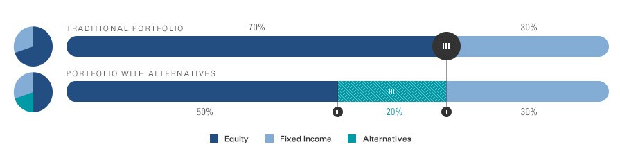 Alternatives are an additional tool that can potentially be used to diversify a portfolio. Alternative strategies may complement an investor’s traditional portfolio by employing tools such as shorting and/or leverage. Incorporating alternatives into a well-diversified portfolio potentially enables investors to access a differentiated source of return, lower the overall risk of their portfolios, and provide shallower drawdowns during market crises.