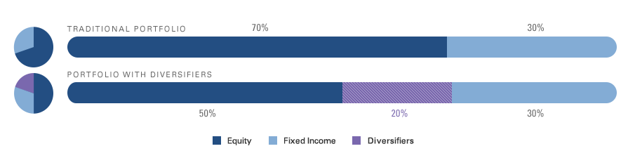 There are many tools that can potentially be used to diversify a portfolio. A "diversifier" is defined as a complement to an investor's traditional, or core, portfolio. Their risks have tended to diverge from the risks of core equities. Incorporating diversifiers into a well-balanced portfolio potentially enables investors to access several different sources of risk and return.
